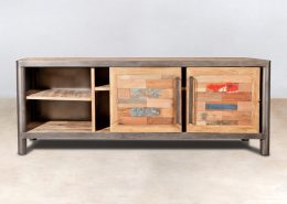 Plateaux et coffrage du meuble TV composés de recyclage de véritables coques de bateaux de pêche indonésiens, retravaillés de façon artisanale, et montés sur une structure métallique, avec 2 tiroirs équipés de glissières métalliques, et parties en métal ajouré, permettant un rangement organisé.