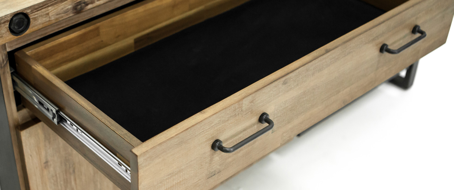 Réalisé en acacia, travaillé de façon artisanale, et monté sur une structure métallique, ce buffet 1 tiroir et 3 portes de la collection LOFT est une pièce unique, car les couleurs dominantes et les variations de teintes du bois d’acacia peuvent varier d’un modèle à l’autre.